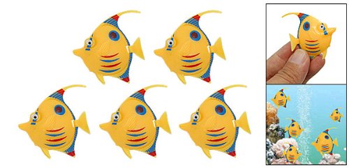 Set of 5 Aquarium Plastic Floating Fish Ornament Yellow.Lifelike Aquarium Floating Fish Set allows the tank to become a living place of art, while providing excellent entertainment for fish.Yellow Plastic Fish swim with a "life-like" action, they are come with built-in weight and moveable tail which offer a natural look and provide stability.Perfect for a aquarium decoration or swim along with them!NOTICE: The water must be moving in the aquarium so that the fish can be floating in it.